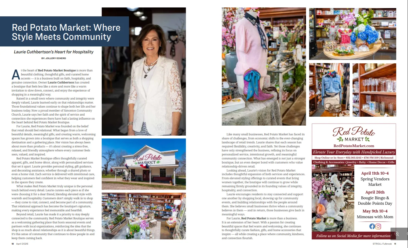 Red Potato Market is a retail store that offers beautifully curated collections of home decor, clothing, gifts and more! Owner, Laurie Cuthbertson, lives her dream in the 1929 historic building (formerly known as the Schultz General Store and most recently Foster Creek Veterinary Hospital) in Richmond, Texas. Through her love for everything home, an eye for design, and a love for people, you will find modern, transitional, and eclectic decor accents in the ever-changing vignettes to inspire your lifestyle.